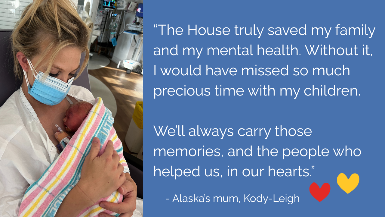 The family moved into the House, where they would stay for 47 nights while Alaska grew stronger in the NICU. For Kody-Leigh, it was more than just accommodation — it was a place to heal, connect, and feel whole again.
