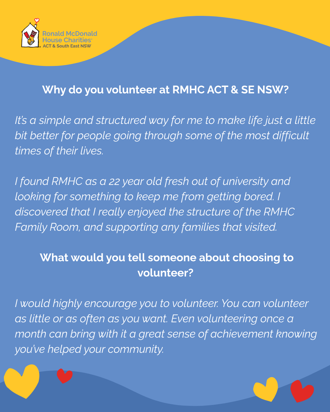At Ronald McDonald House ACT & SE NSW, every act of kindness makes a world of difference, and our volunteers are at the heart of it.